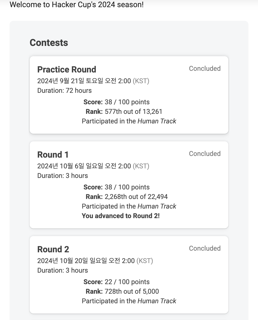 1년만에 다시해보는 해커컵이었는데, 1라운드에서 A를 틀려서 망했나 싶었지만 2라운드에서 A2까지 빠르게 풀고 B의 테스트케이스가 약해서 그런지 다 텨져버려 순위가 너무 올랐다. 1000등 안에 드는건 본 라운드에서 처음해보는 기록이었는데, 한정판 티셔츠를 받을 수 있다는 것이 기쁘다. 못풀었던 문제를 나중에 업솔빙하면서 풀어보고 다음번에는 코드포스 블루이상을 찍은 실력을 가지고 3라운드에 진출하고 싶다.